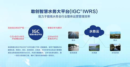 敢創智慧水務大平臺(IGC?IWRS)采用C/S+B/S+M/S相結合開發模式,以WebGIS 系統為中心,建立統一的智慧水務數據庫平臺,規范數據格式及建庫標準,將供水、排水、防洪排澇、水資源、水利環保等專業的應用管理業務信息發布到WebGIS平臺,實現管理科學化、現代化。